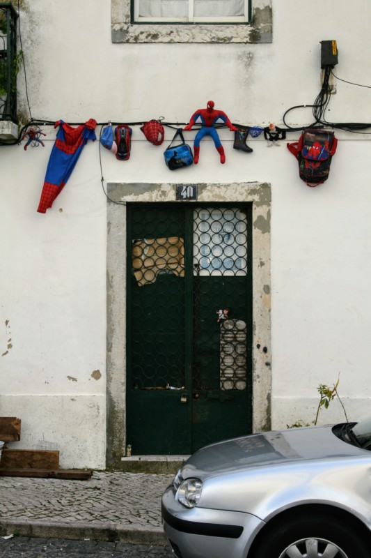 in der altstadt von lissabon, ziemlich weit unten, fast am tejo, da wohnt spiderman in der hausnummer 40. seinen kram hat er zum trocknen aufgehangen, wie man das eben macht in dieser stadt. und wie üblich steht er sicher in einem der zahlreichen cafés, gönnt sich pastéis und kaffee.