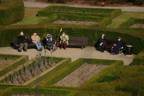 Oben im Wedding, genauer: Gesundbrunnen, gibt es den Humboldthain. Mit Flakturm und vielen Bäumen. Und mittendrin der Rosengarten. Ein englischer Garten, mit labyrinthisch angelegten Gehecke und – der Name sagt es – Rosengestrüpp. Zieht dann natürlich die entsprechende Klientel an wie das Licht die Motten: Alte, Gehetzte und Familien. Und da sitzen sie dann und werden grünflächig von der Arbeit abgehalten. Das ist mal wieder typische Mensch: sucht Zerstreuung und entspannt, als hätte er keine anderen Probeme.