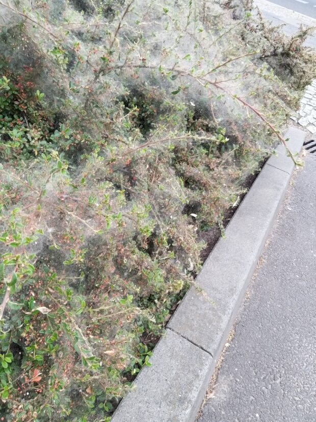 der feine herr ackerbau nebenan ist sich offenbar zu schade, die probleme hier im kiez anzusprechen. seit ein paar tagen legt sich ein dichtes gespinst über die gräser auf der wiese vorm örtlichen einkaufsladen. es sieht wirklich gruselig aus, als hätte sich die erde aufgetan und schlimme spinnen an die oberfläche entlassen.