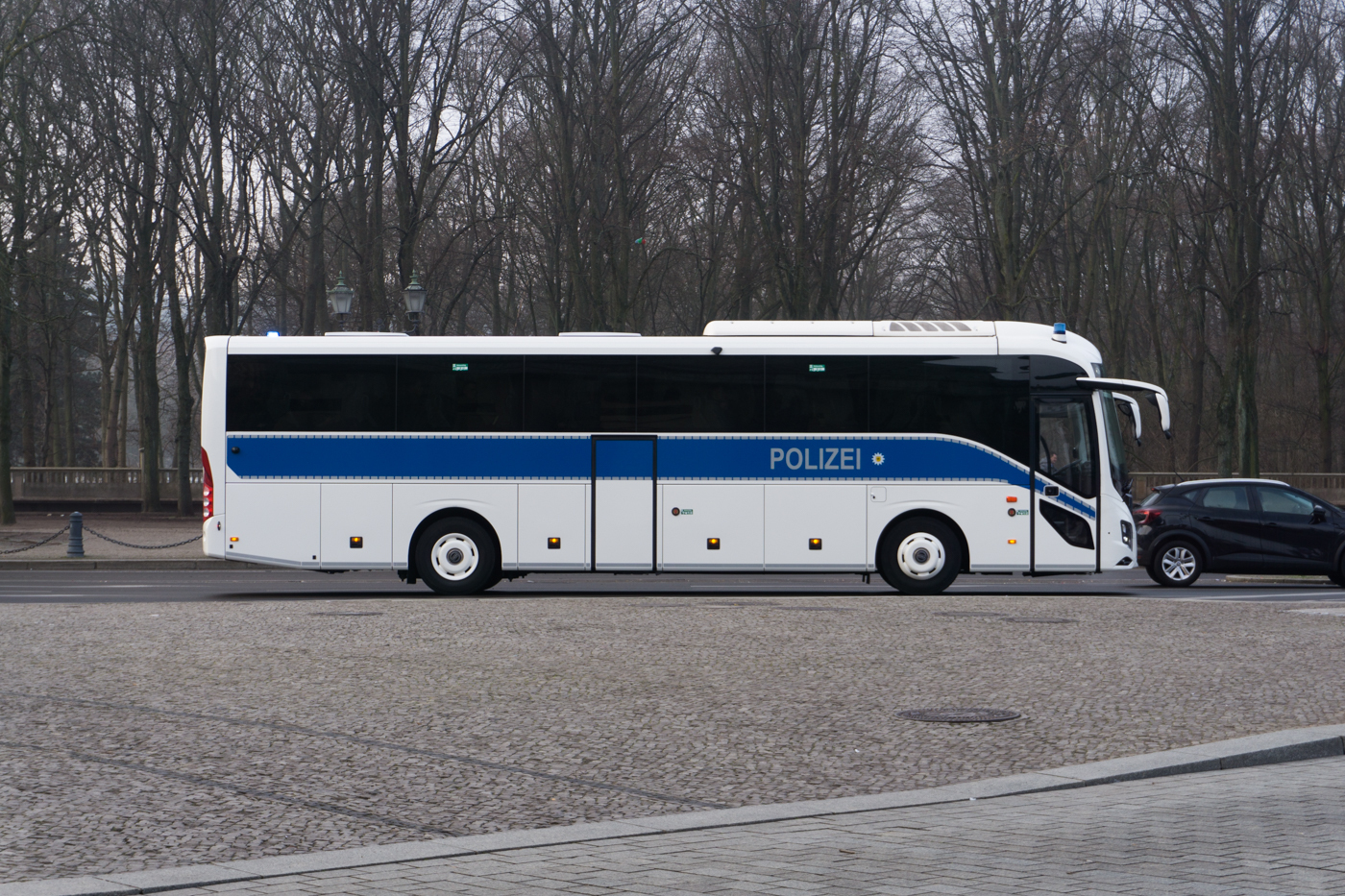 nichts los am brandenburger tor, der schaden vom unfall im januar ist noch nicht repariert. mehrere reisbusse mit großer POLIZEI-aufschrift düsen den 17. juni runter, die scheiben getönt, sodass man nicht sieht, ob wer drinnen sitzt.