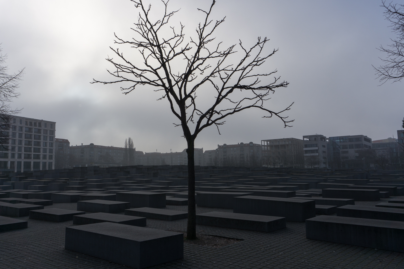 nebel über dem holocaust-mahnmal, düster, so grau in grau. ob der architekt diese wirkung beabsichtigt hat?