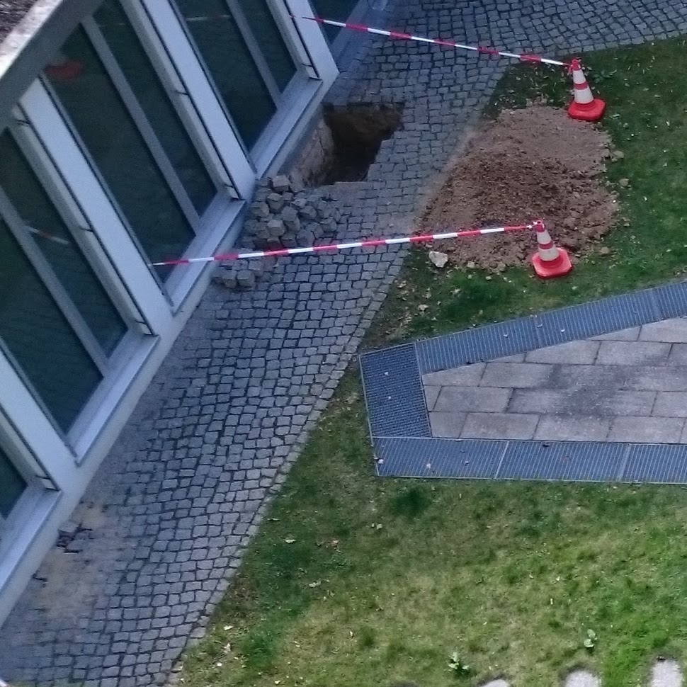 links oben im bild eine weitere grube, nah am haus. vielleicht auch einbrecher, die sich in büroräume graben wollten? oder in eine bank, aber sie haben die pläne falschrum gehalten und sind hier im hof rausgekommen?