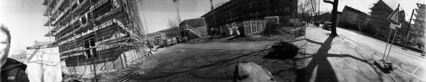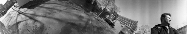 was ein spaß, eine 360°-Kamera mit kleinbildfilm. so richtig klappt es nicht immer mit einer vollen drehung, aber ist auch egal. die perspektive ist super. spaziergang durch pankow, was sonst. und weil ich auf allen bildern drauf bin (fast unvermeidlich), bin ich jetzt influencer. es werden auch die führungslöcher belichtet (sprocket holes), aber die bekomme ich nicht mit gescannt in meinem scanner.