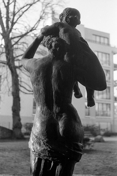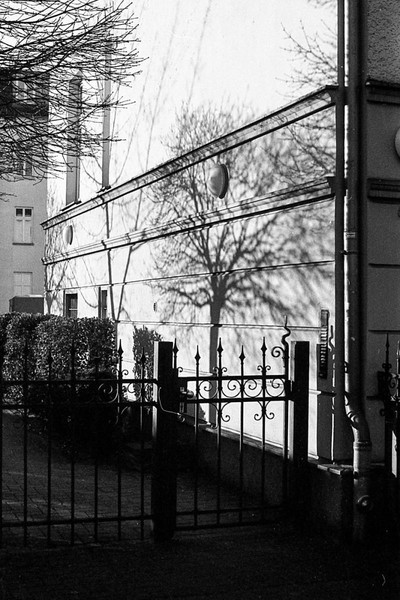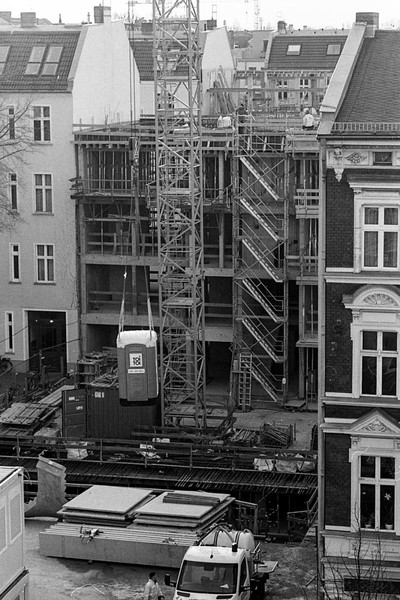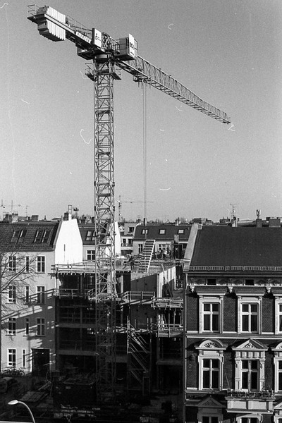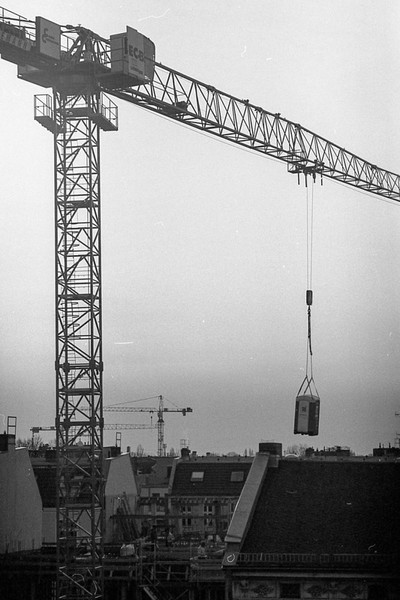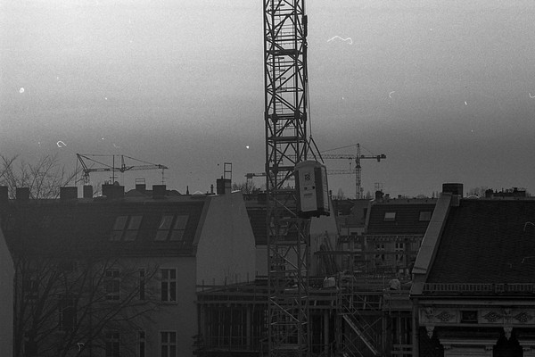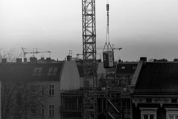 noch ein rest ostsee und pankreich. auf der baustelle gegenüber wird ein klo mit dem kran transportiert. sonnenstrahl in der schönholzer heide.