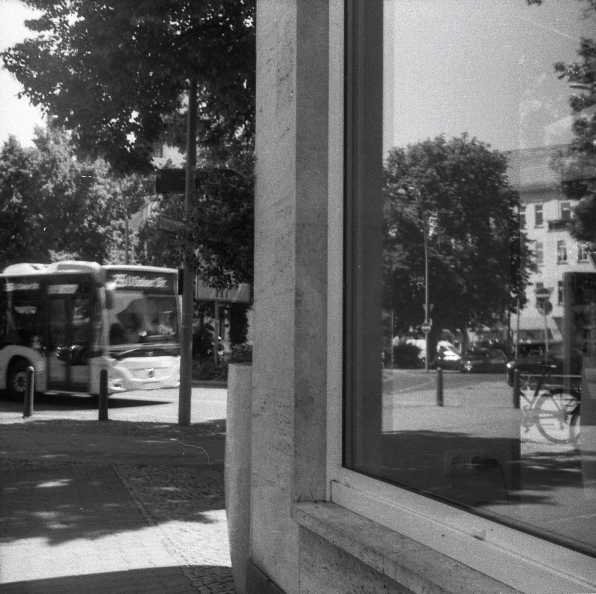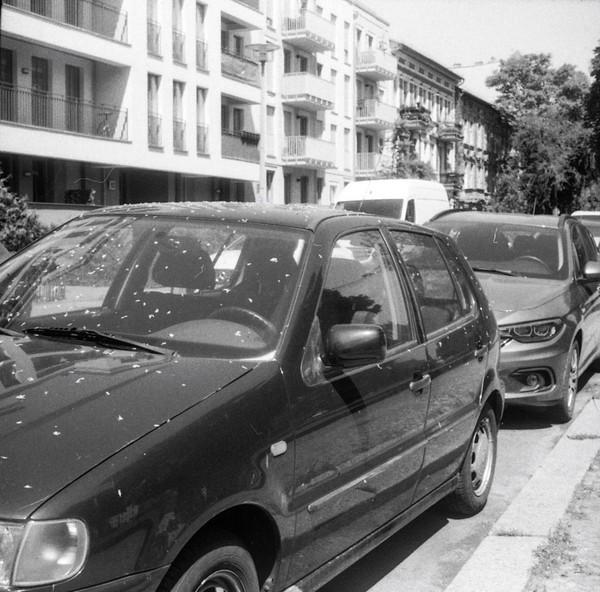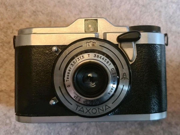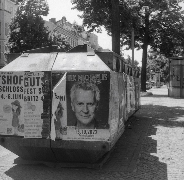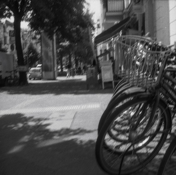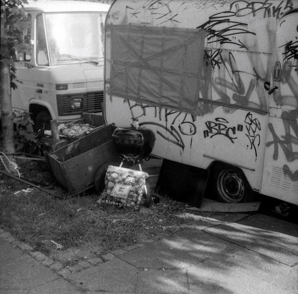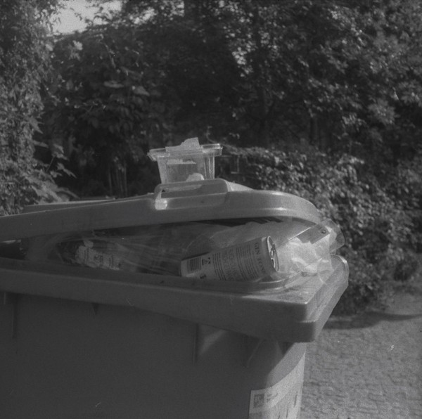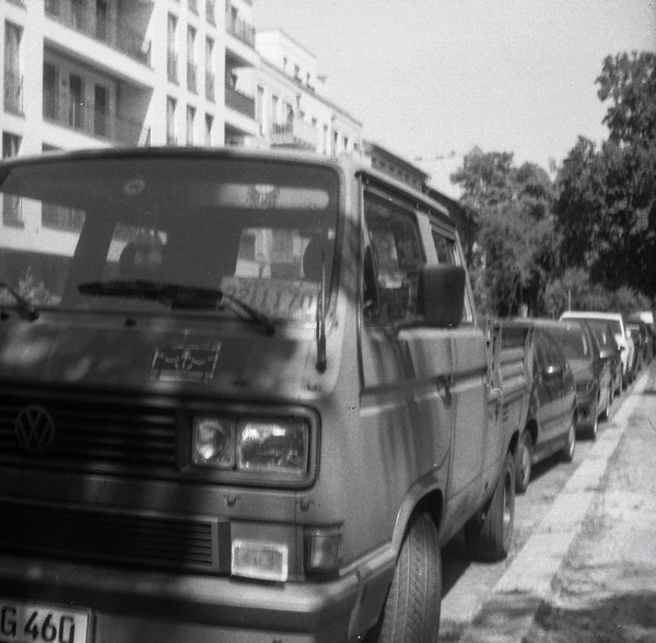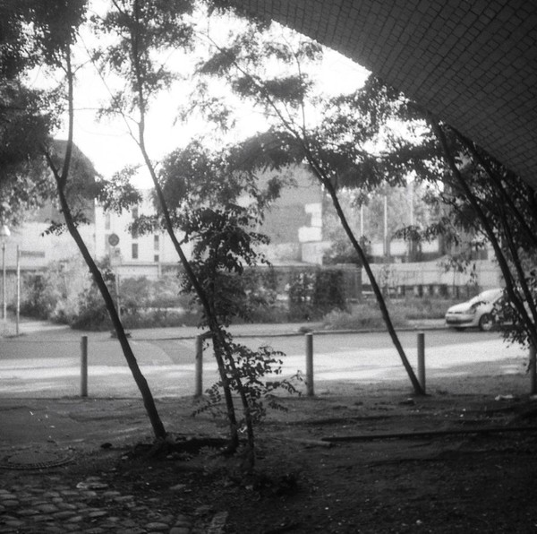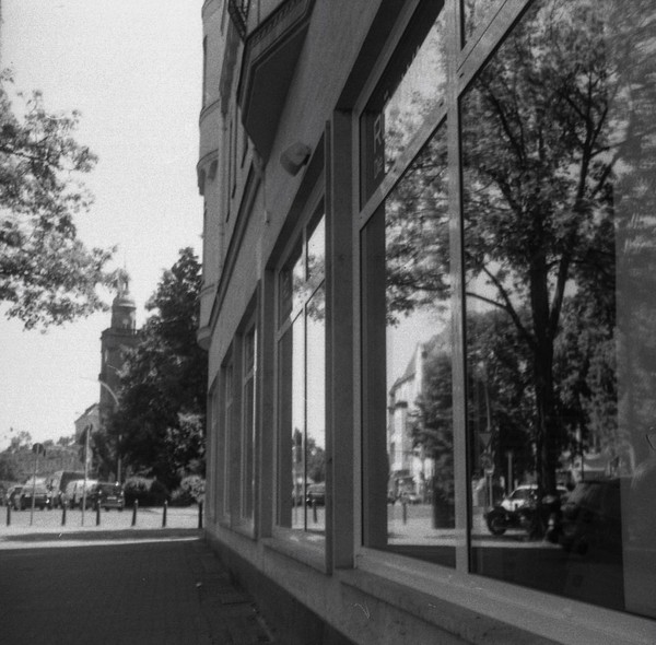 mit der taxona habe ich nur einen, ebendiesen film belichtet. den andere film habe ich zerstört, als ich die kamera geöffnet habe, ohne ihn korrekt zurück gespult zu haben. das liegt an einem grundlegenden problem, der transportmechanismus passt nicht zu aktuellen filmkasetten, eine gute beschreibung und lösungsansätze finden sich hier. spannend: die taxona macht quadratische bilder auf einem normalen kleinbildfilm, also hat man 50 statt 36 aufnahmen. mehr als ein kleines guckloch gibts nicht, der fokus wird geschätzt. hat aber ganz gut funktioniert.