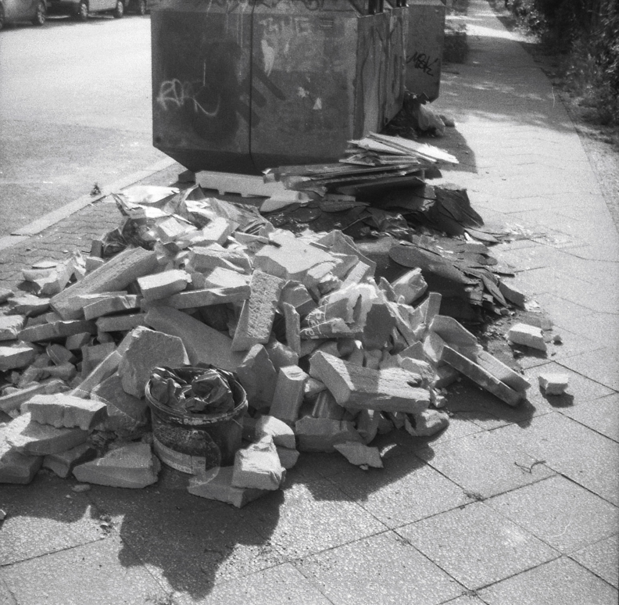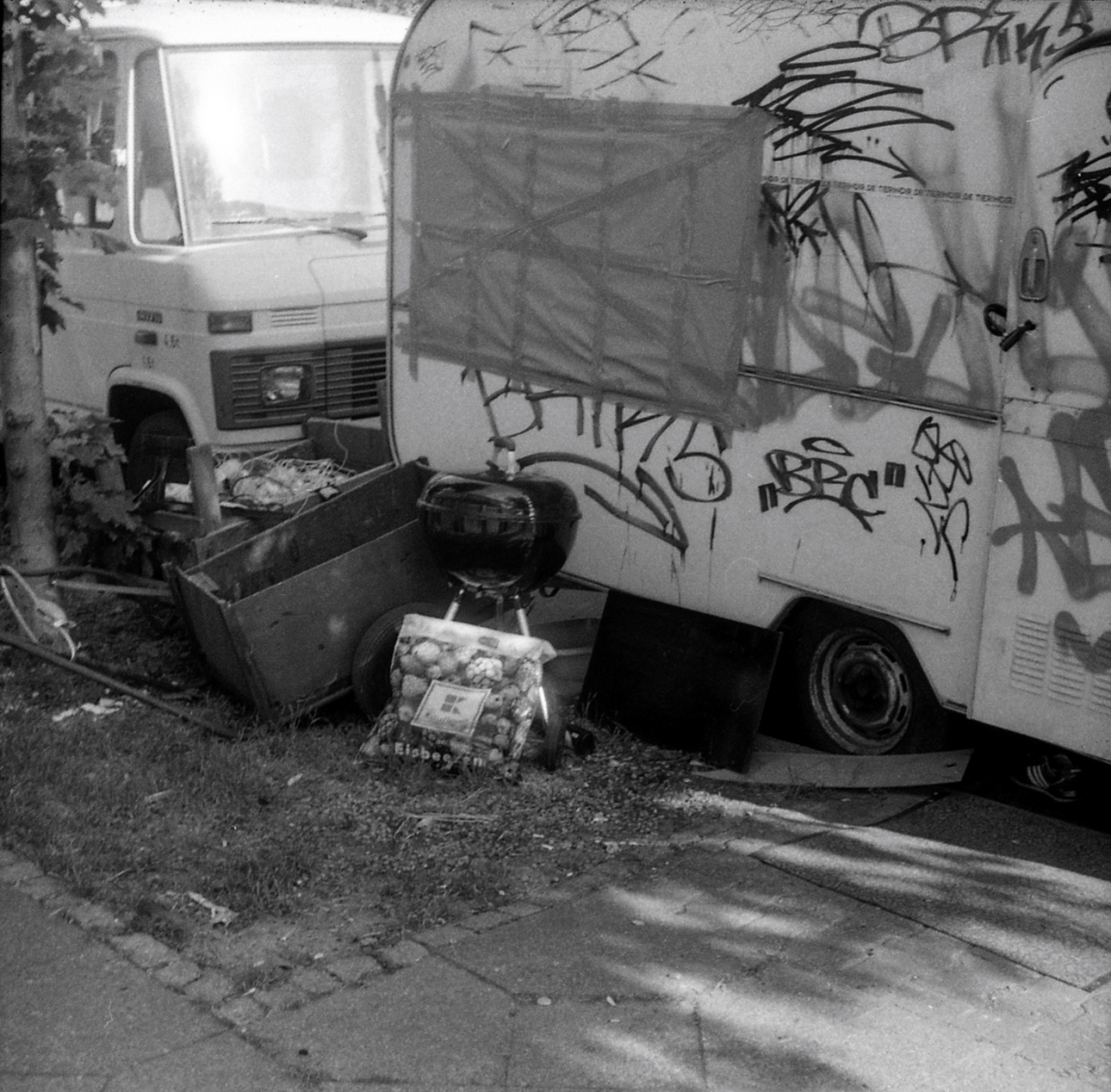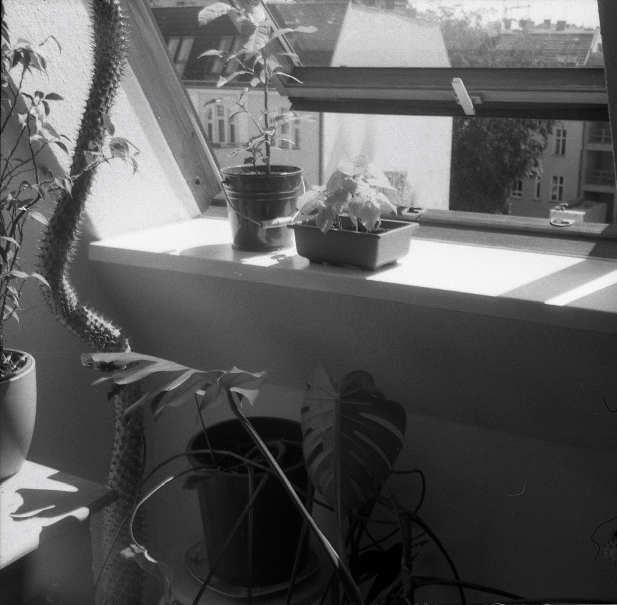 mit der taxona habe ich nur einen, ebendiesen film belichtet. den andere film habe ich zerstört, als ich die kamera geöffnet habe, ohne ihn korrekt zurück gespult zu haben. das liegt an einem grundlegenden problem, der transportmechanismus passt nicht zu aktuellen filmkasetten, eine gute beschreibung und lösungsansätze finden sich hier. spannend: die taxona macht quadratische bilder auf einem normalen kleinbildfilm, also hat man 50 statt 36 aufnahmen. mehr als ein kleines guckloch gibts nicht, der fokus wird geschätzt. hat aber ganz gut funktioniert.