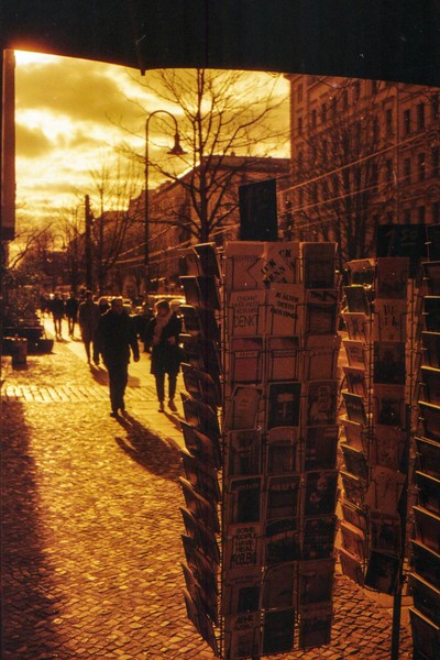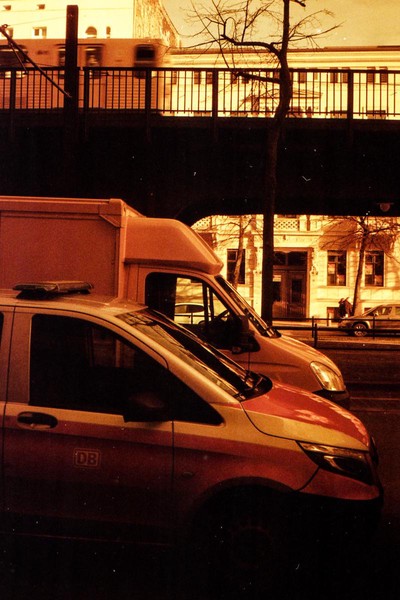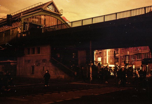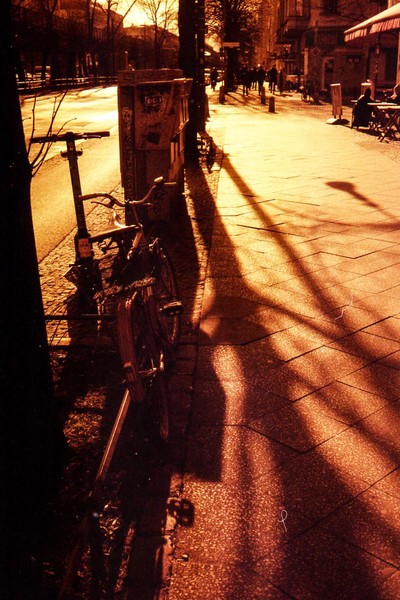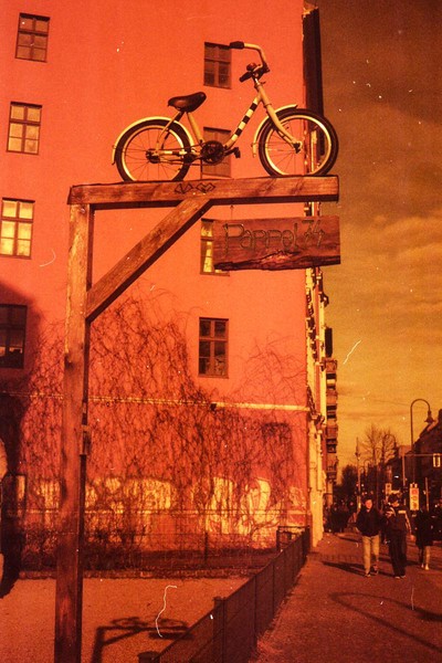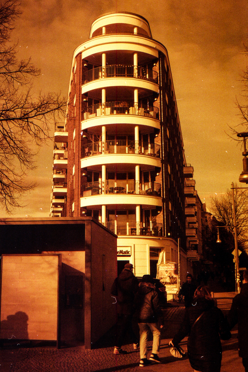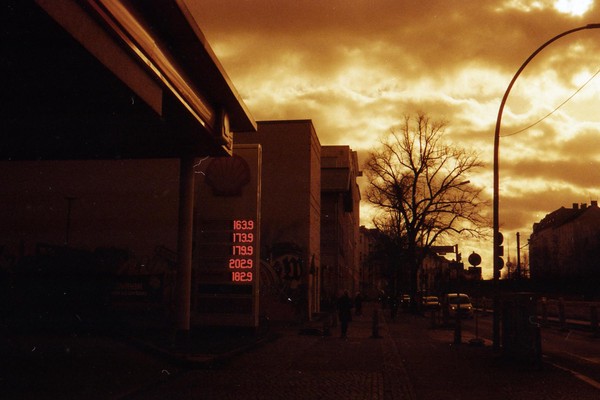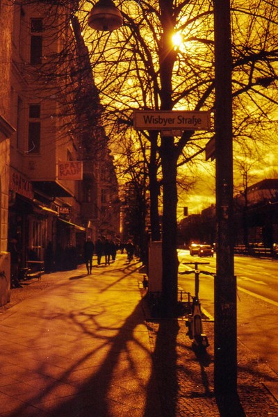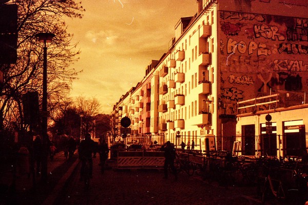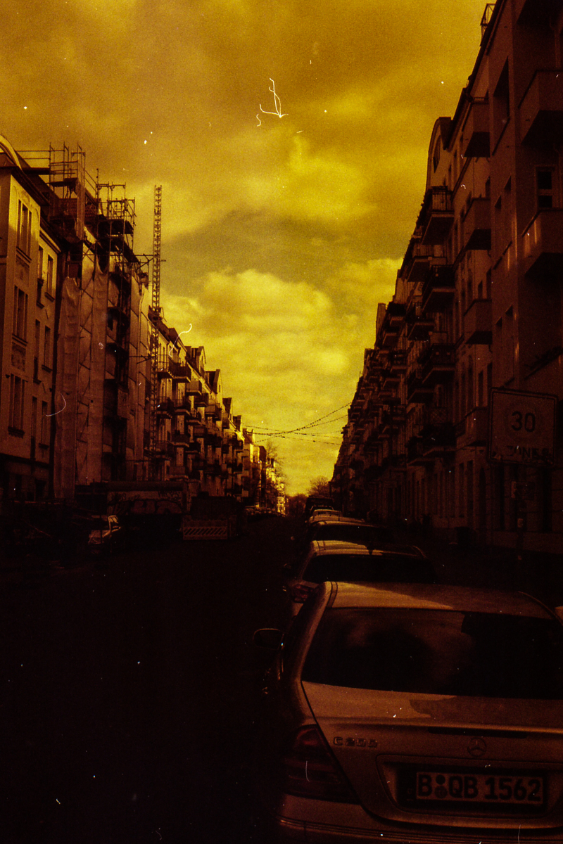 was aussieht wie apokalypse, ist ein normaler farbfilm, der von der anderen seite belichtet wurde (redscale). solcherlei filme gibts im handel, hier habe ich den film im wechselsack umgespult. spaziergang durch prenzlauer berg im februar.