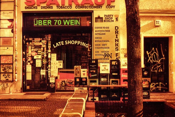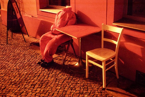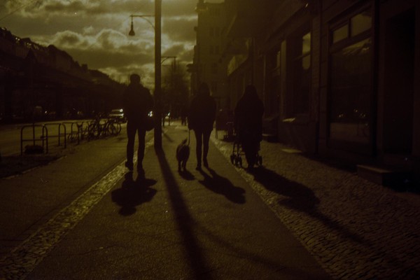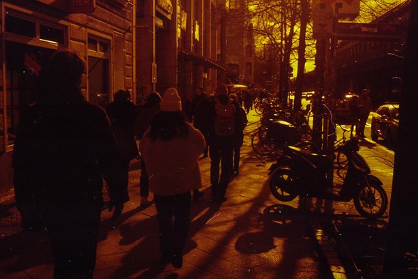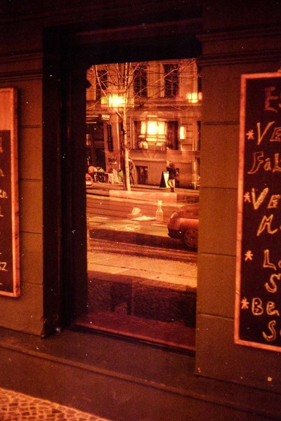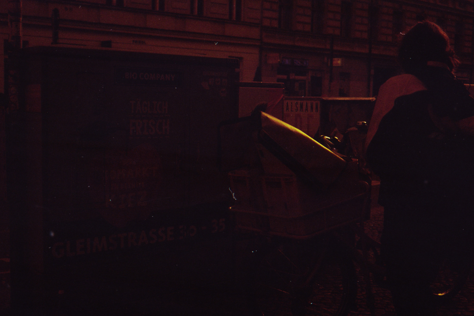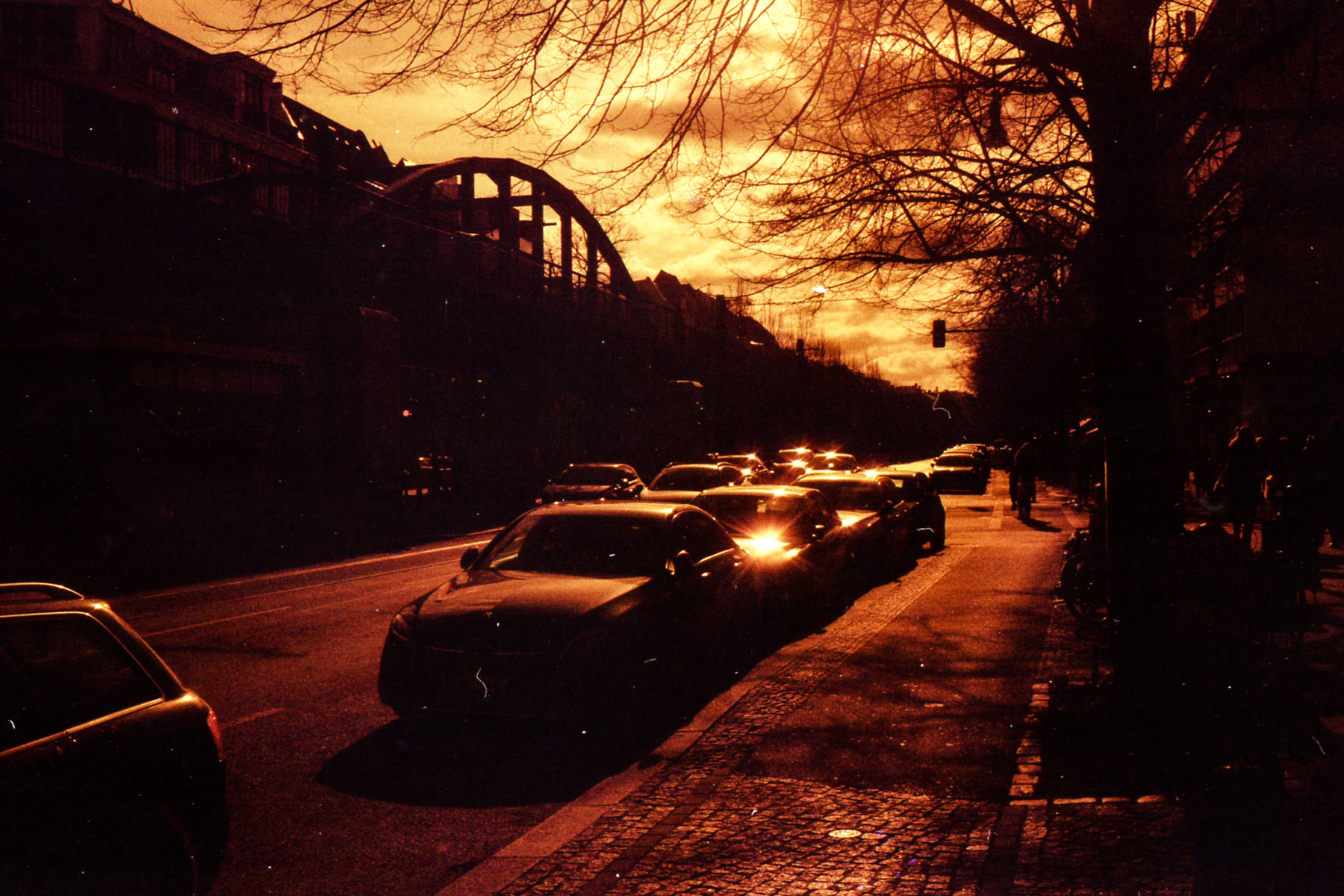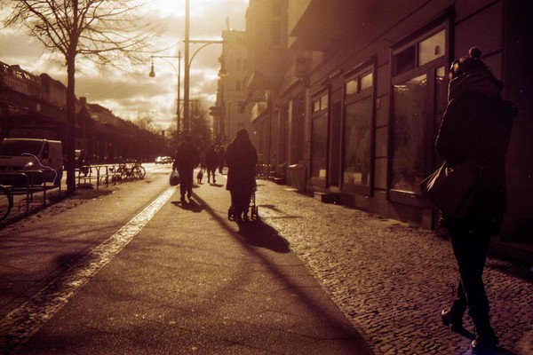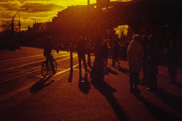 was aussieht wie apokalypse, ist ein normaler farbfilm, der von der anderen seite belichtet wurde (redscale). solcherlei filme gibts im handel, hier habe ich den film im wechselsack umgespult. spaziergang durch prenzlauer berg im februar.