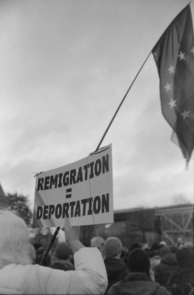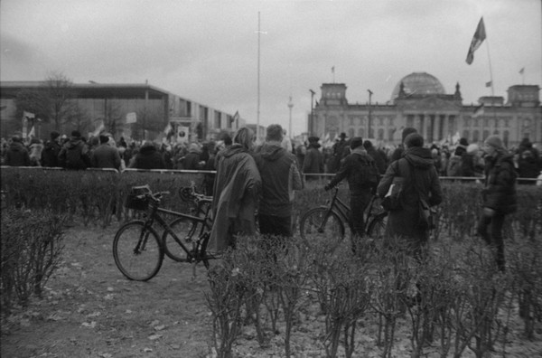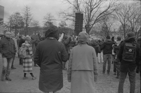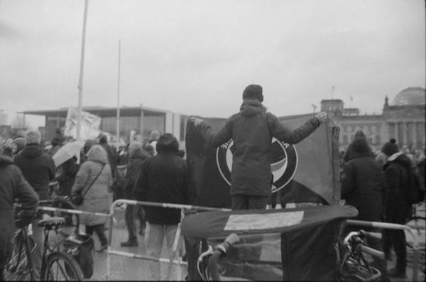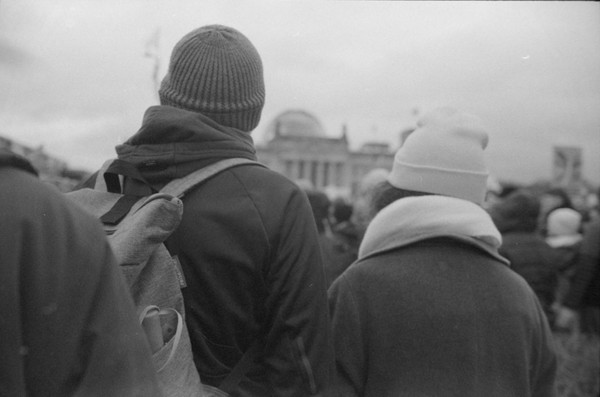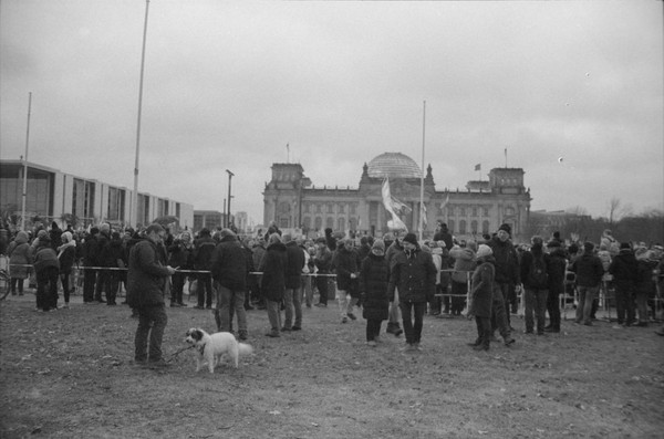 000251 - 02/24 Apr 21, 2024 📷 Leica M5 🎞️ Ilford Delta 400 🥫 Kodak HC-110 1+31 6,5min 💻 Sony Alpha 6000 eine demo gegen rechts im februar, das wetter ist mies, aber die wiese vor dem reichstag gut besucht. 📂 35mm berlin 🏷️ berlin berlin-mitte demonstration