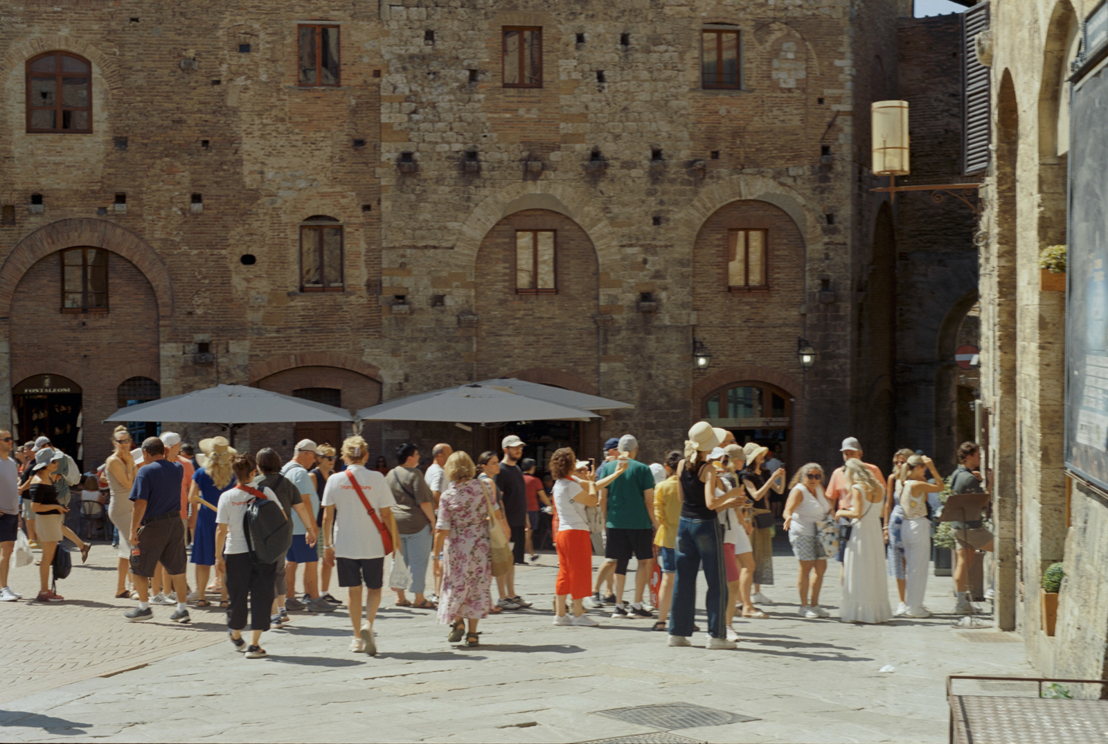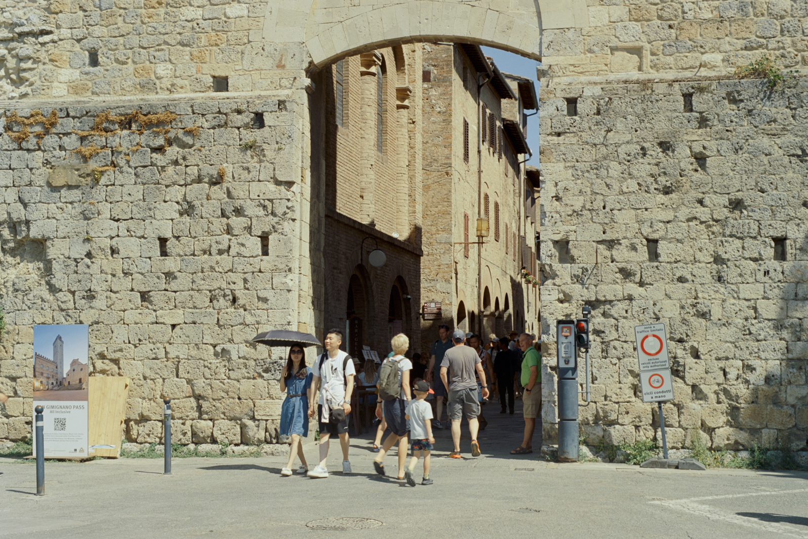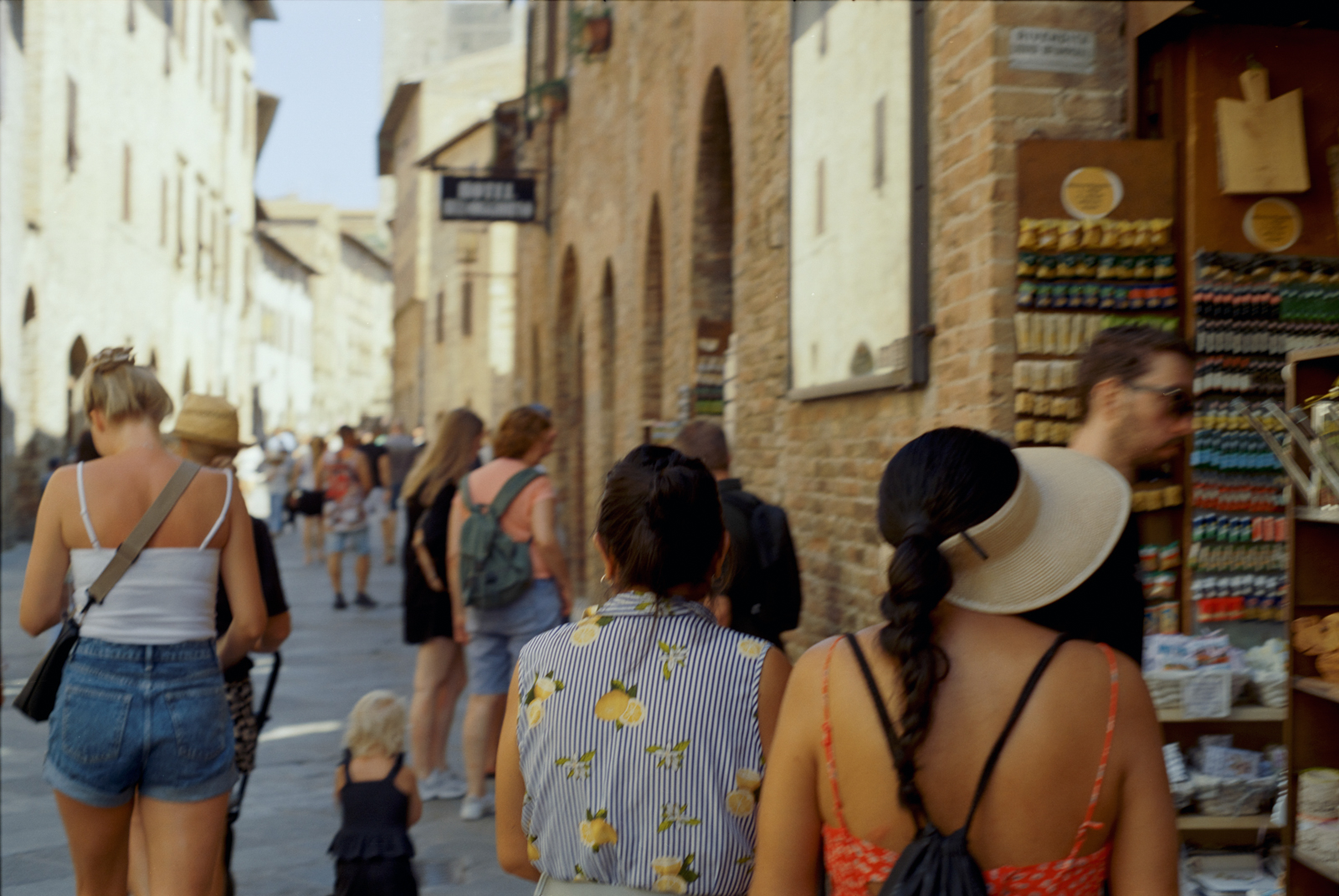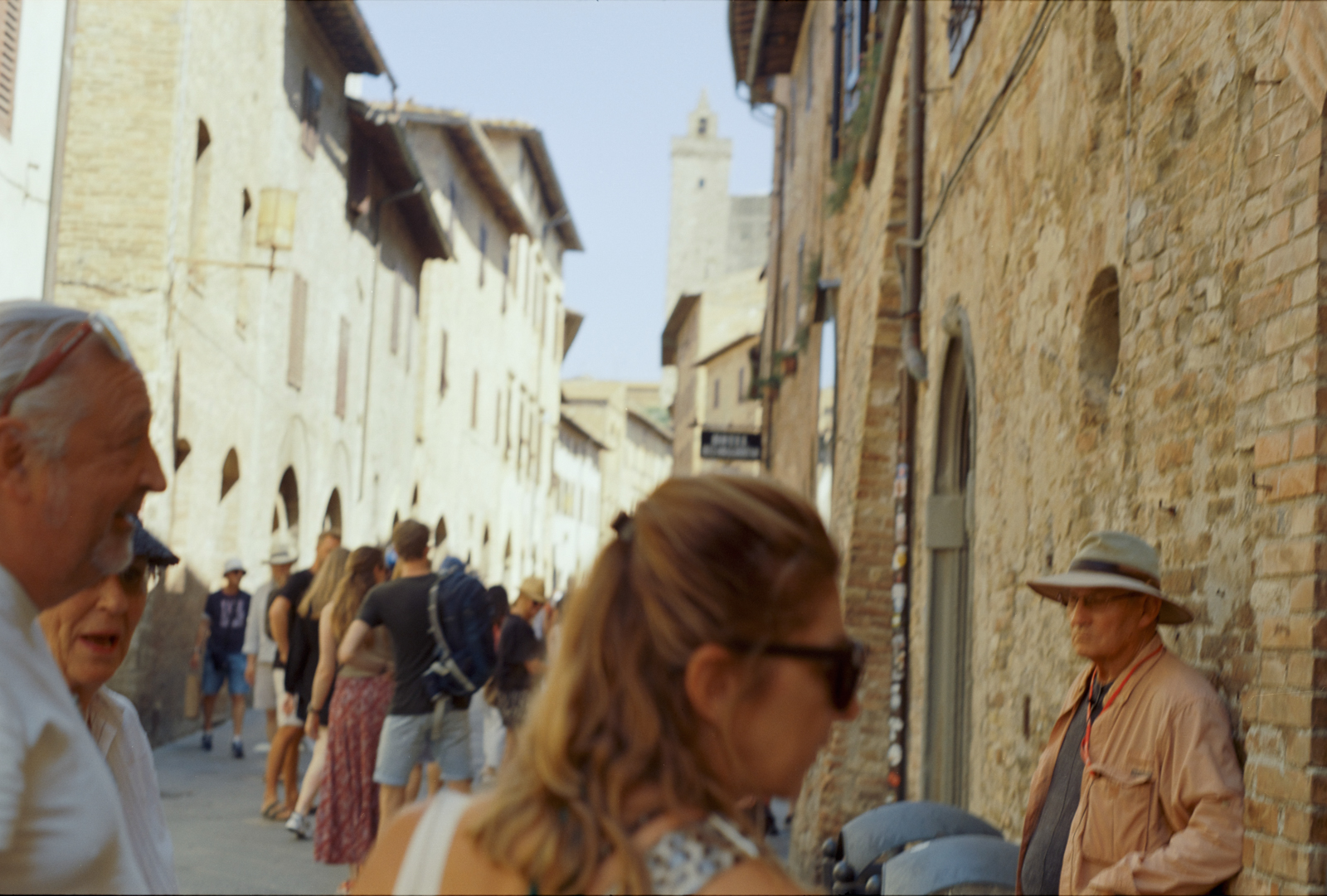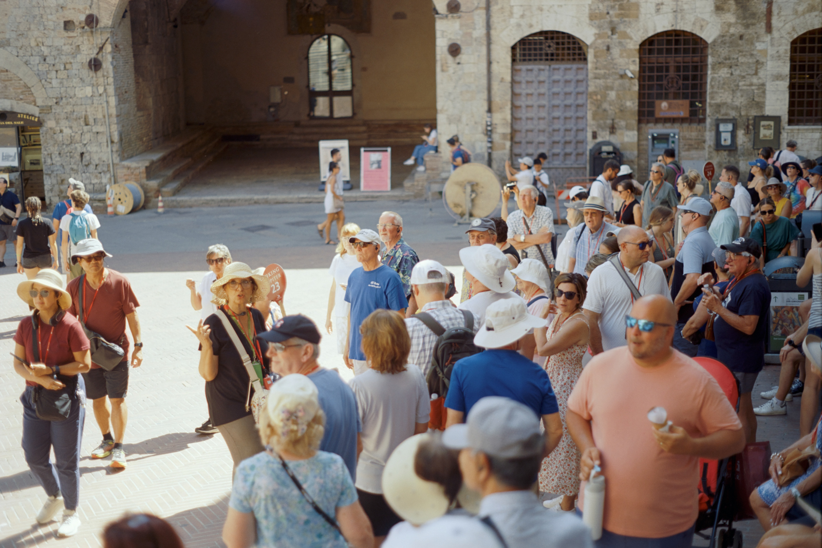 wir streunern durch San Gimignano, die sonne knallt und touristengruppen schieben sich durch die mittelalterliche stadt.
