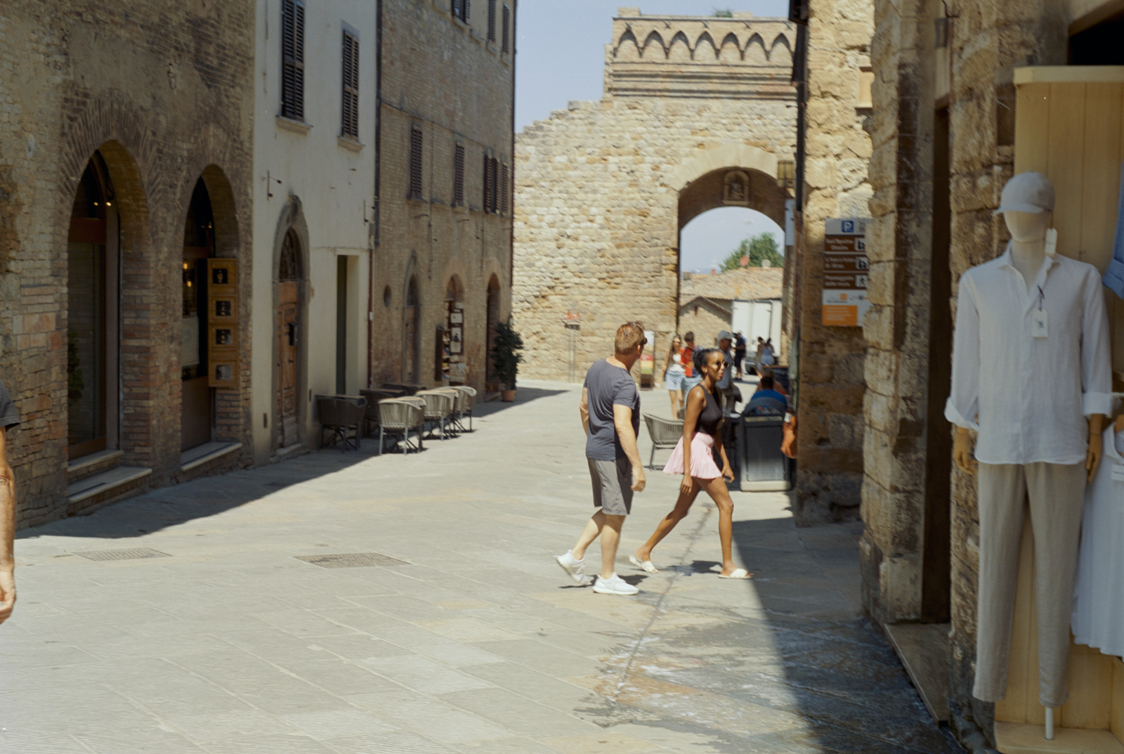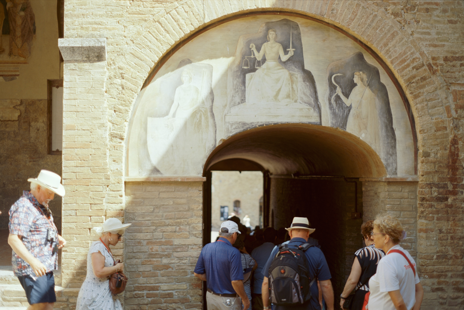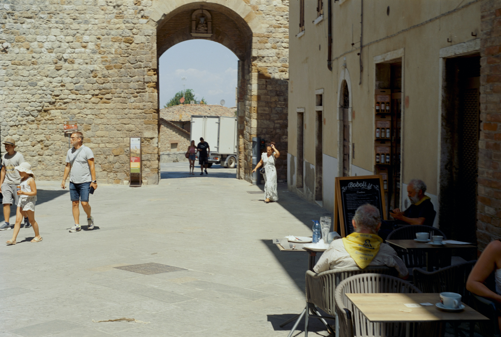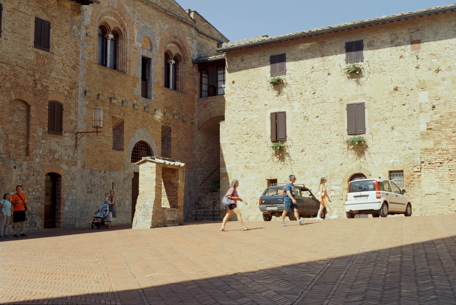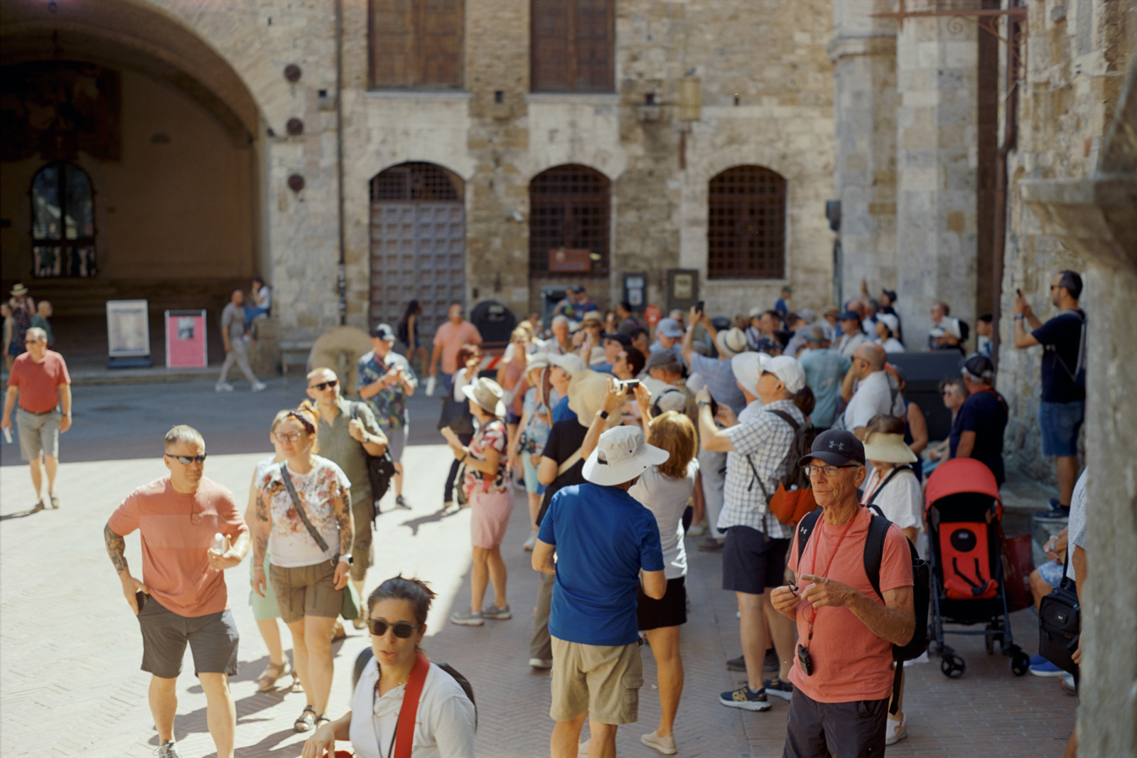 wir streunern durch San Gimignano, die sonne knallt und touristengruppen schieben sich durch die mittelalterliche stadt.