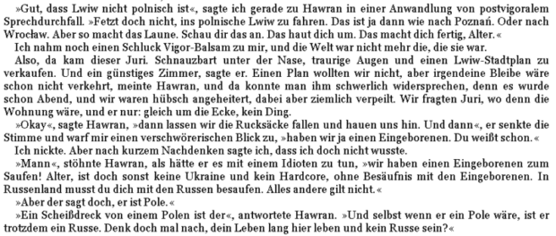 Nach Hinter der Blechwand (2009) von Stasiuk ein ähnliches, und doch ganz anderes Buch. Hier reist ein polnischer Backpacker durch die Ukraine und erlebt mit verschiedenen Mitreisenden wilde Geschichten, die zu Gonzos destiliert, stark an Hunter S. Thompson und Jack Kerouac erinnern. Hinter den Sauf- und Absturzgeschichten verbirgt sich die Analyse der polnischen Geschichte, der Frage nach der Identität und Herkunft. Wieviel Polen, wieviel Europa steckt in der Ukraine? Die Geschichten triefen nur so von Alkohol, Potenzkräuterschnaps und kaputten Menschen und Städten. Aber sie erzählen auch von einer gespaltenen Beziehung beider Länder, die sich auseinander gelebt haben, wie ein altes Ehepaar und doch ähnlicher sind, als sie zugeben wollen.
