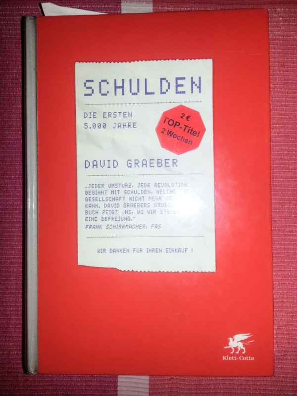 ein wichtiges buch. graeber, anthropologe und mit-initiator und vordenker der #occupy-bewegung, erklärt die sozialgeschichte der schulden und des kreditsystems. dabei holt er weit aus und untersucht diverse ur-gesellschaften. die these, dass nicht der tauschhandel am anfang war, hatten wir schon bei Sedláček ((Sedláček, Thomas: Die Ökonomie von gut und böse. München, Verlag Carl Hanser, 2012)) gelesen. nein, die kleinen gesellschaftlichen einheiten sind immer kommunistisch - wobei er diesen begriff im ursprünglichen meint. das heißt, dass wir untereinander nicht rational und ökonomisch handeln, sondern halt freundschaftlich, ihr kennt das. graeber kommt unter anderem zu dem schluss, dass schulden und kreditwesen uralt sind und noch vor dem geld existierten. und auch eine moralische kategorie sind. aber er hinterfragt diese haltung auch und regt zum nachdenken an. denn schulden sind vor allem ein machtintrument. der schuldner unterwirft sich und der gläubiger stärkt seine machtposition. das wurde oft systematisch gemacht, schon immer, bis heute.