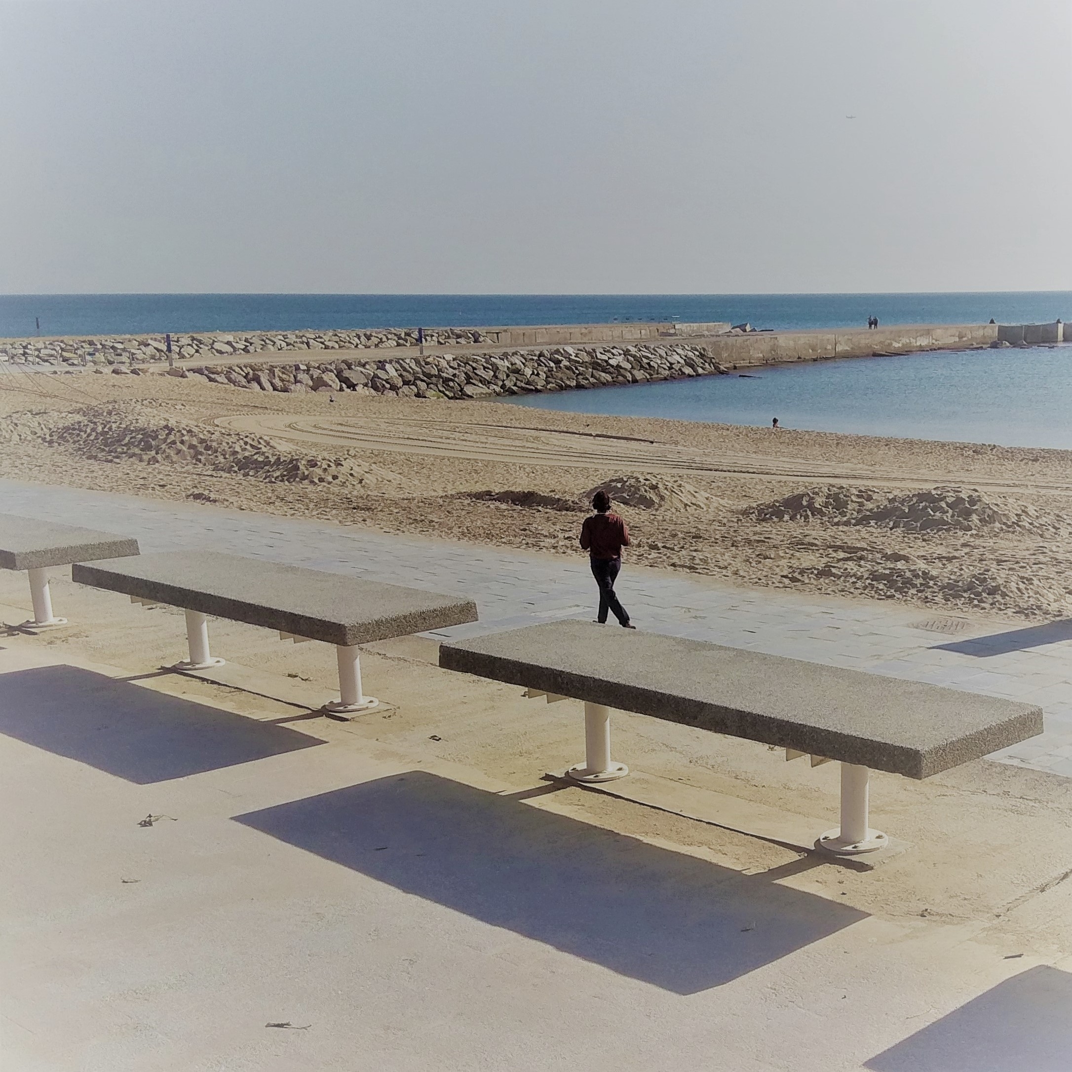 im februar in barcelona. ein sehr kleiner mensch joggt auf der strandpromenade, sonst ist nicht viel. es gibt noch keinen killervirus und das wetter ist auch schön.