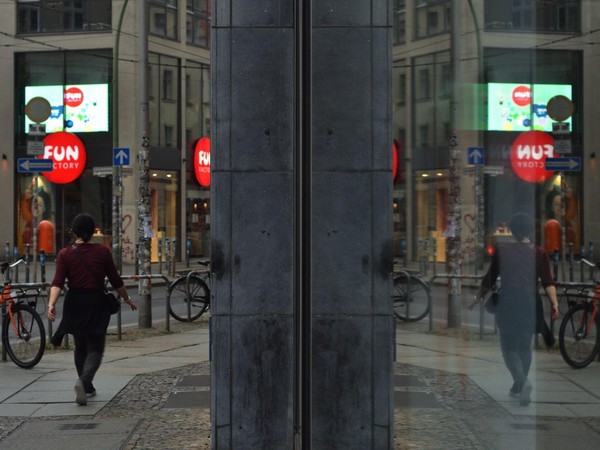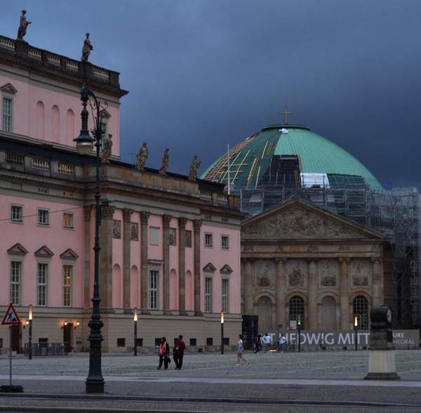 wir nähern uns der stadt, indem wir sie uns photographisch und ästhetisch aneignen. die stadt ernährt uns mit ihren eindrücken, bildern, geschichten. wir müssen nur vor die tür treten, die kamera mitnehmen und losstapfen, richtung egal. hinter jeder kreuzung eine andere welt und hinter tausend stäben keine welt. forschen schrittes erklimmen wir den prenzlauer berg, düstere wolken ziehen über die weinberge am rosenthaler. im wald unter den linden sie sonntägliche waldesruh, zieht es uns zum tore hinaus. vorbei am schloß, das sie wieder hübsch aufgebaut haben und sich selbst zitieren. ein in stein gebaute selbstreferenz, um sich zu vergewissern, noch da zu sein. leuchtend das christliche kreuz auf der kuppel, ein erbärmlicher rückgriff auf glorifizierte vergangenheit.